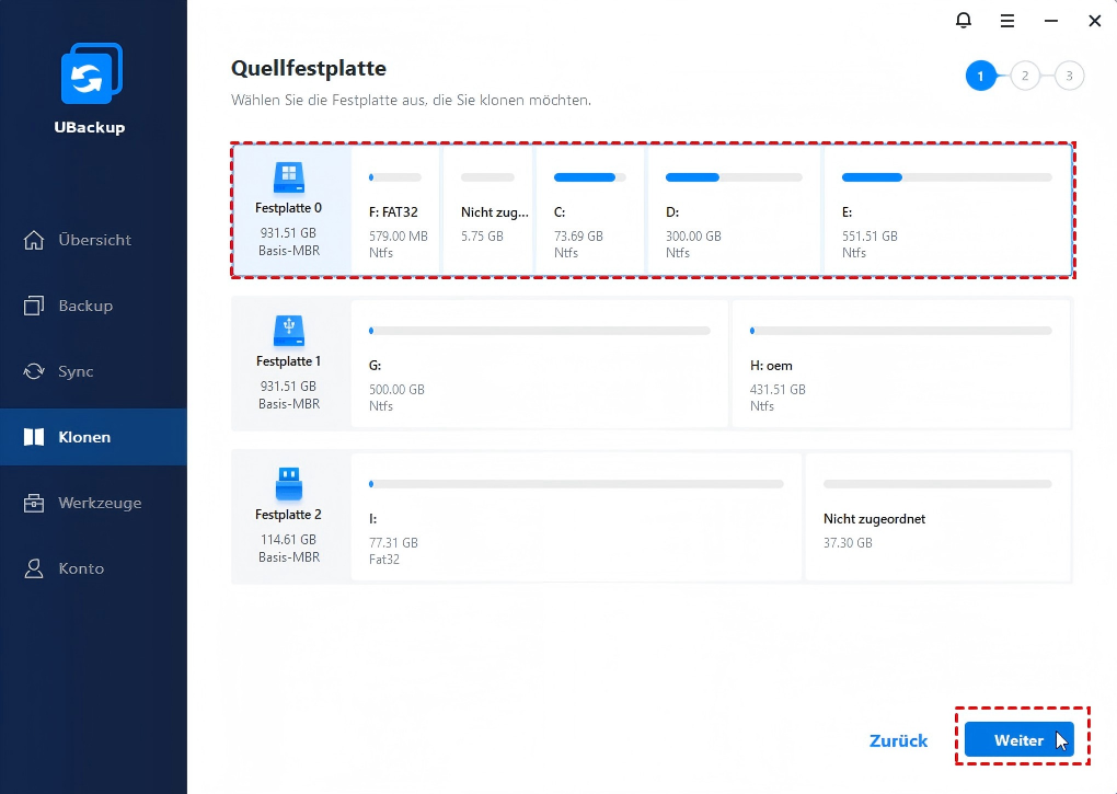 Schritt 2. Wählen Sie die Quellfestplatte (Disk0) aus, die Sie klonen möchten, und klicken Sie dann auf die Schaltfläche Weiter.