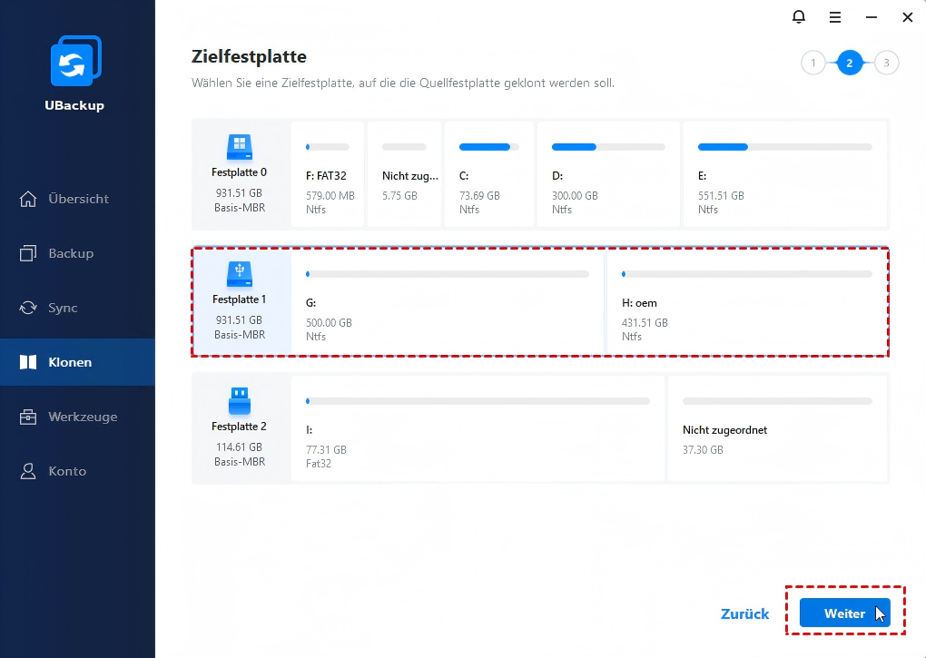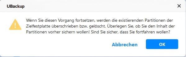 Tipp: Wenn die Zielfestplatte nicht leer ist, erscheint eine Meldung, die besagt, dass die Zielfestplatte überschrieben oder gelöscht wird. Wenn Sie bereits ein Backup der Zielfestplatte erstellt haben, können Sie mit OK fortfahren.