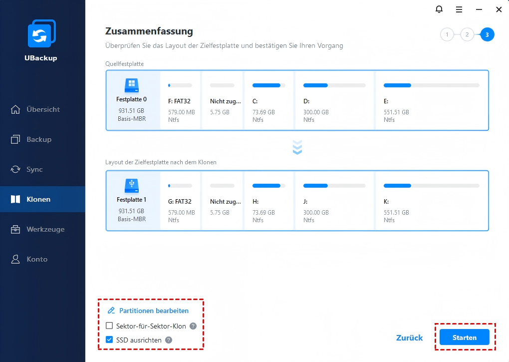 Schritt 4. Da Sie eine Festplatte auf eine SSD klonen, ist es ratsam, die Option SSD ausrichten zu aktivieren, indem Sie das entsprechende Kästchen ankreuzen. Dadurch wird die Leistung und Lebensdauer der SSD optimiert. Sobald Sie die Einstellungen überprüft und bestätigt haben, klicken Sie auf die Schaltfläche Starten, um den Klonprozess sicher zu starten.