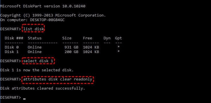 - attributes disk clear readonly (dieser Befehl ändert die Attribute, so dass sie nicht mehr schreibgeschützt sind)