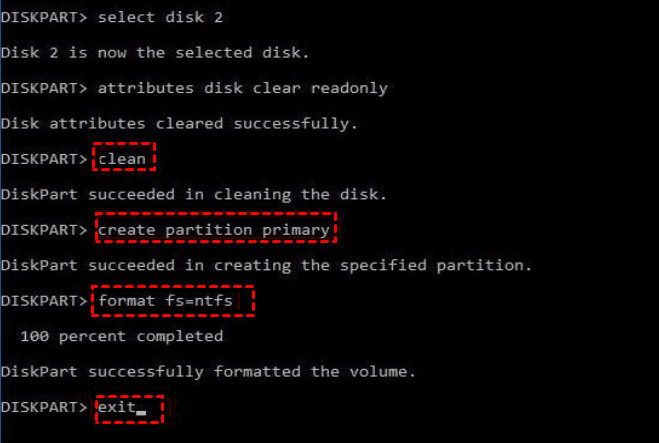 Schritt 3. Um den Inhalt des Laufwerks zu formatieren oder zu löschen, geben Sie die folgenden Befehle ein, die nach jeder Zeile durch die Eingabetaste getrennt sind.