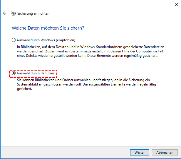 4. Wenn Sie die Dateien, die automatisch gesichert werden sollen, selbst auswählen möchten, kreuzen Sie die Option „Auswahl durch Benutzer“ an.