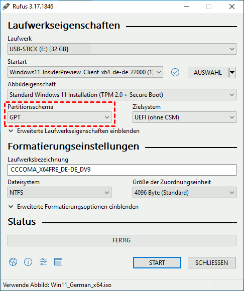 Nachdem Sie die Windows 10 ISO-Datei mit dem Media Creation Tool erstellt haben, können Sie auch Rufus nutzen, um Windows 10 Live-USB zu erstellen. Folgen Sie den nachstehenden Anweisungen: