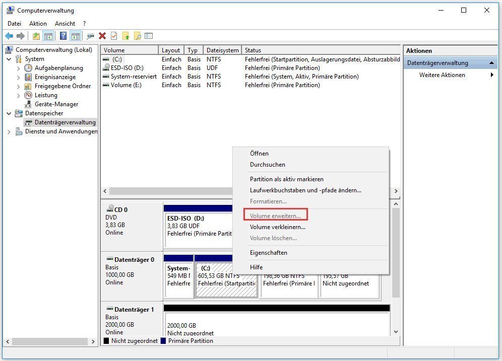 Wenn der Speicherplatz auf der Festplatte knapp wird, können Sie die Datenträgerverwaltung öffnen, um das Problem zu lösen, indem Sie die Systempartition erweitern.