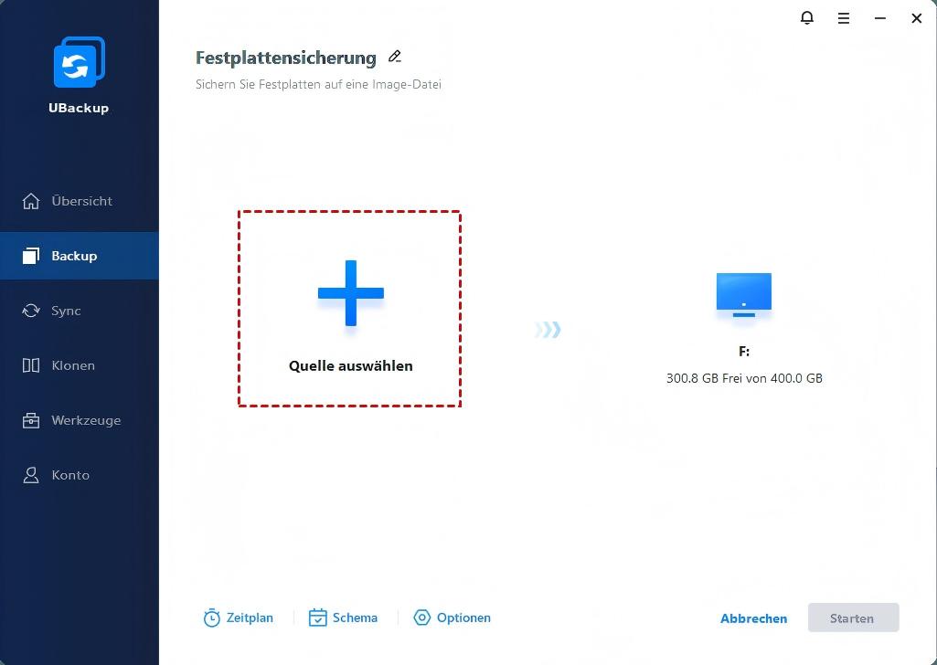 - Klicken Sie auf + Festplatte hinzufügen, um die Quellfestplatte auszuwählen, die Sie sichern möchten. Wählen Sie dann den Speicherort aus, an dem Sie das Backup-Image speichern möchten.