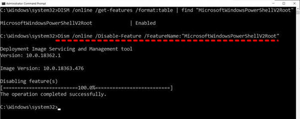 - Dism /online /Disable-Feature /FeatureName:"MicrosoftWindowsPowerShellV2Root"