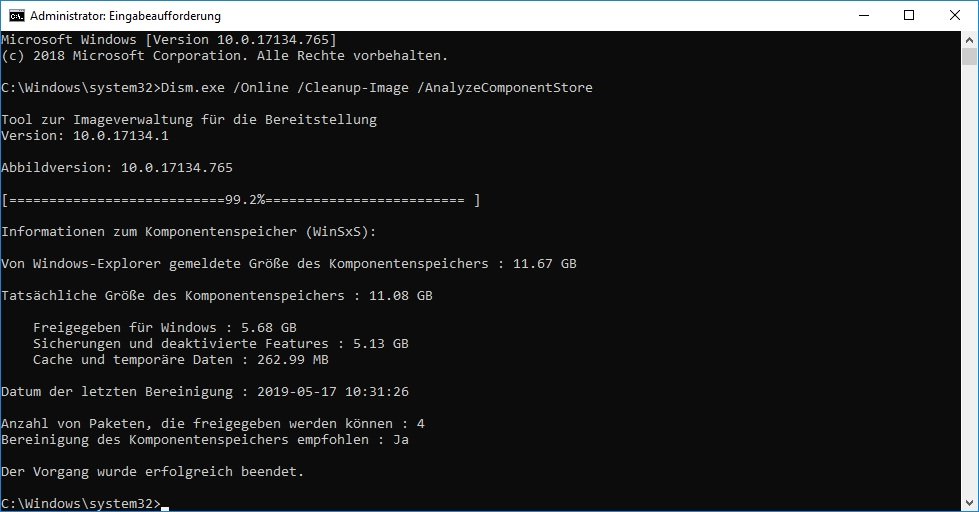 Schritt 5. Warten Sie, bis der Prozess abgeschlossen ist. Sie sehen die Größe des WinSxS-Ordners unter dem Abschnitt Tatsächliche Größe des Komponentenspeichers.