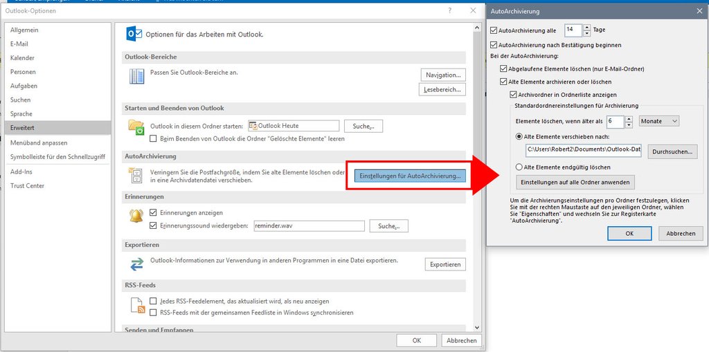 4. Klicken Sie auf Einstellungen für AutoArchivierung….