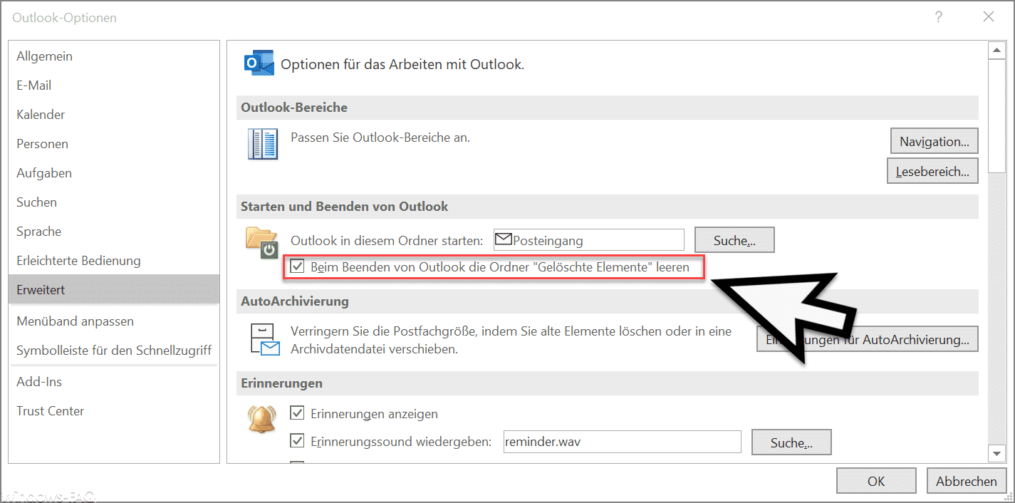 Outlook kann so eingestellt sein, dass beim Beenden automatisch der Papierkorb geleert wird. Gehen Sie wie folgt vor, um die automatische Löschfunktion zu deaktivieren.