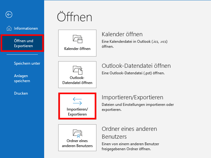 1. Öffnen Sie auf dem neuen Computer die Outlook-Desktop-Anwendung. Wählen Sie die Registerkarte Datei. Wählen Sie in der Kategorie Öffnen und Exportieren die Option Importieren/Exportieren.