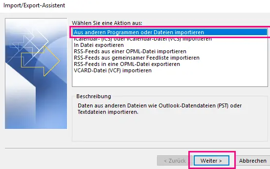 2. Wählen Sie im Import- und Export-Assistenten die Option Aus anderen Programmen oder Dateien importieren und wählen Sie dann Weiter.