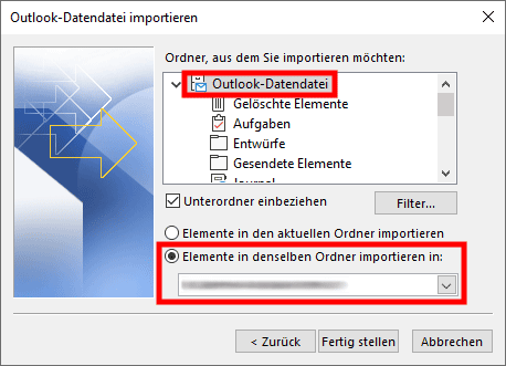 6. Der oberste Ordner (normalerweise Persönliche Ordner, Outlook-Datendatei oder Ihre E-Mail-Adresse) wird automatisch ausgewählt. Die Option Unterordner einbeziehen ist standardmäßig aktiviert. Alle Ordner unterhalb des ausgewählten Ordners werden importiert.