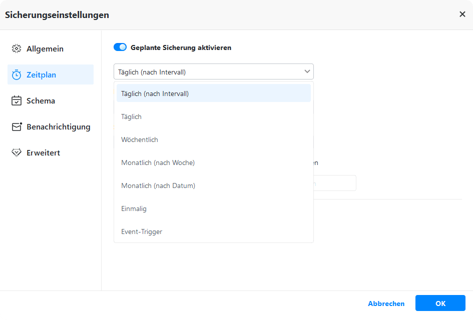 ♦ Es ermöglicht Ihnen die automatische Sicherung von Outlook-Ordnern mit Täglich, Wöchentlich, Monatlich oder Event-Trigger Intervallen. Bei einer geplanten Sicherungsaufgabe können Sie den Computer sogar zu einer bestimmten Zeit aufwecken, um die Sicherung durchzuführen.