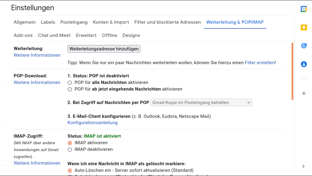 - Gehen Sie in Gmail zu den Einstellungen > Weiterleitung und POP/IMAP und aktivieren Sie IMAP.