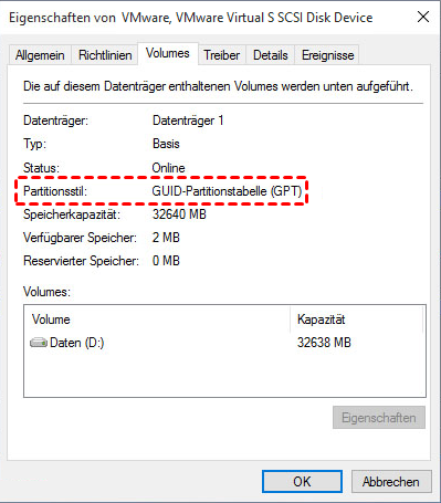 Am einfachsten ist es, mit der rechten Maustaste auf den Datenträger zu klicken und „Eigenschaften“ > „Volumes“ zu wählen. Dann sehen Sie GPT oder MBR neben „Partitionsstil“.
