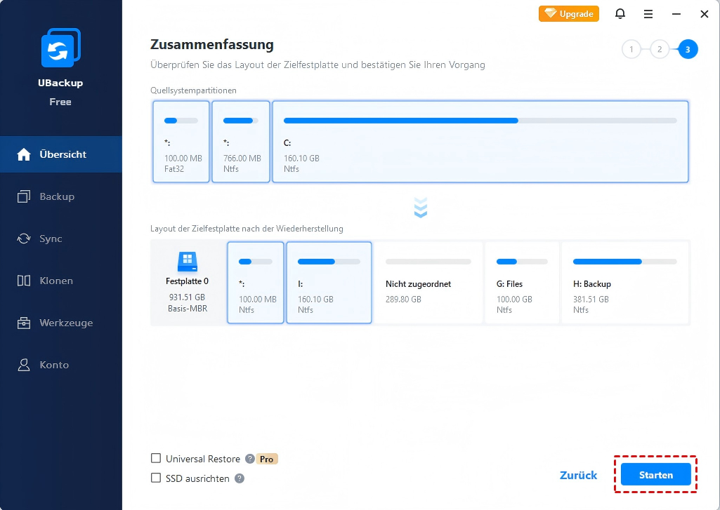 Klicken Sie auf die Registerkarte „Übersicht“ > „Wiederherstellen“ und folgen Sie den Anweisungen auf dem Bildschirm, um UBackup zu starten, bis Sie sich im Fenster „Zusammenfassung“ befinden. Bitte vergewissern Sie sich, dass die Funktion „Universal Restore“ aktiviert ist. Falls nicht, aktivieren Sie diese und klicken Sie dann auf Starten.