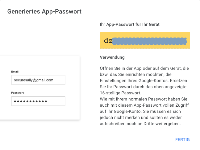 - Passwort: Bitte geben Sie hier das App-Passwort für Ihr Google-Konto ein.