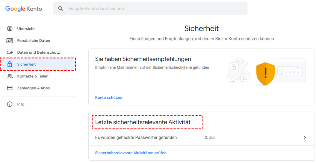 2. Klicken Sie auf „Sicherheit“ --> „Letzte sicherheitsrelevante Aktivität“.