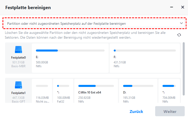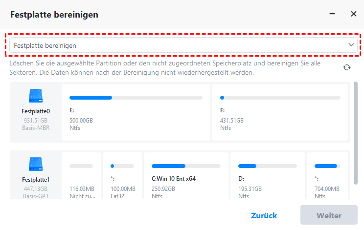 Wenn Sie diese Option auswählen, können Sie alle Partitionen auf der Festplatte löschen und alle Sektoren bereinigen. Die Daten werden nach der Bereinigung nicht wiederhergestellt.