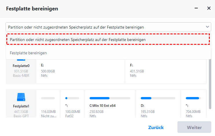 Wenn Sie auf der vorherigen Seite die Option „Partition oder nicht zugeordneten Speicherplatz auf der Festplatte bereinigen“ auswählen, können Sie auf dieser Seite jede Partition oder nicht zugeordneten Speicherplatz einer beliebigen Festplatte löschen und mehrere gleichzeitig auswählen.