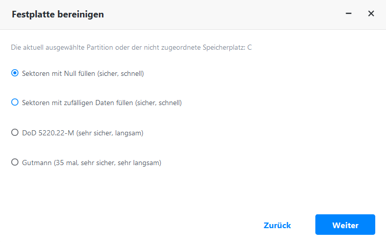 Nachdem Sie diese Option ausgewählt haben, können Sie die ausgewählte Partition oder den nicht zugeordneten Speicherplatz auf der Festplatte löschen und alle ihre Sektoren bereinigen. Die Daten werden nach der Bereinigung nicht wiederhergestellt.