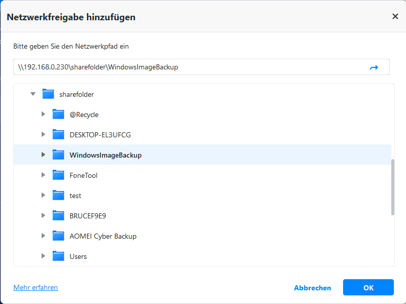 5. Nach dem Hinzufügen des NAS-Geräts werden alle Ordner unter dem NAS-Gerät aufgelistet. Wählen Sie einen Ordner als Zielpfad aus und klicken Sie auf OK.