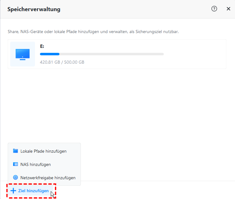 Klicken Sie im Pop-up-Fenster auf die Schaltfläche „Ziel hinzufügen“ und wählen Sie „NAS hinzufügen“. Geben Sie im Fenster den NAS-Pfad ein und klicken Sie rechts auf die blaue Schaltfläche.