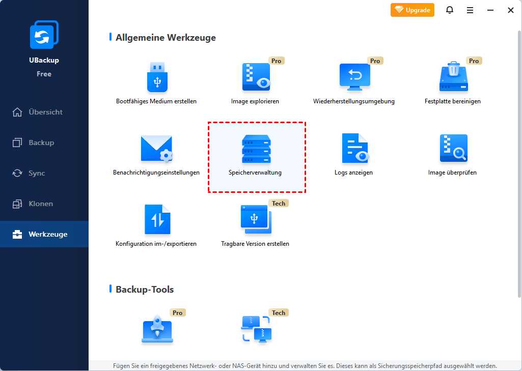 Bevor Sie einen Vorgang starten, laden Sie UBackup Standard herunter und installieren Sie es auf Ihrem Computer. Lernen Sie dann das Tool „Speicherverwaltung“ kennen und sichern Sie später Ihre Dateien.