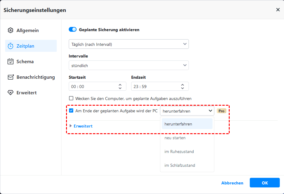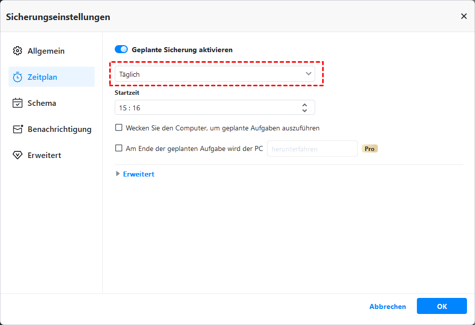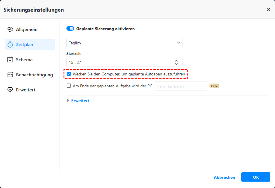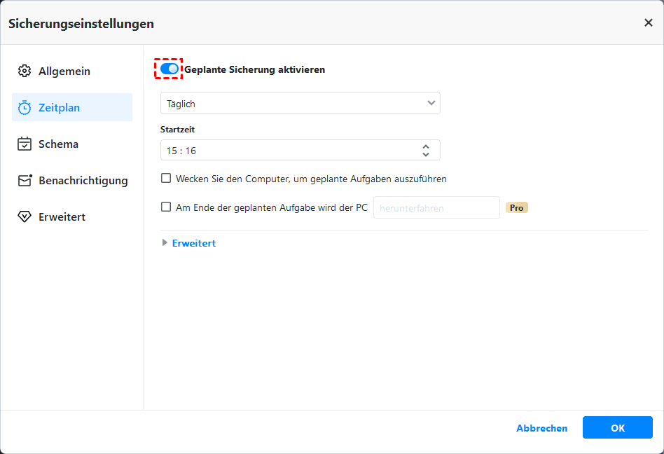 In den „Erweitert“-Zeitplaneinstellungen können Sie „Verpasstes Backup beim nächsten Systemstart ausführen“ ankreuzen, damit ein verpasstes Backup beim nächsten Systemstart ausgeführt wird, wenn der PC vor dem geplanten Backup-Zeitpunkt heruntergefahren wird.