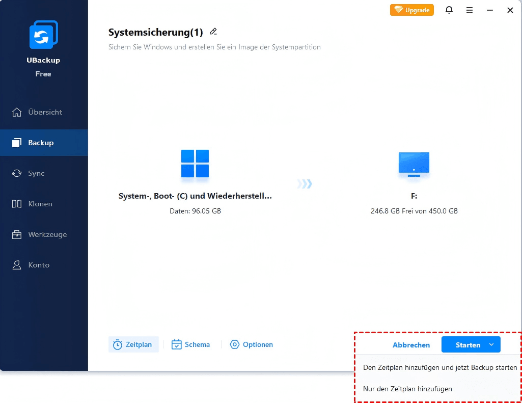 Nachdem Sie die Zeitplaneinstellungen konfiguriert haben, können Sie auf die Schaltfläche „Starten“ klicken: Wählen Sie entweder „Den Zeitplan hinzufügen und jetzt Backup starten“ oder „Nur den Zeitplan hinzufügen“. Wenn Sie „Nur den Zeitplan hinzufügen“ wählen, wird die Sicherung nicht sofort ausgeführt, sondern die geplante Sicherungsaufgabe wird zur Registerkarte „Übersicht“ hinzugefügt und wartet darauf, zum geplanten Sicherungszeitpunkt ausgeführt zu werden.