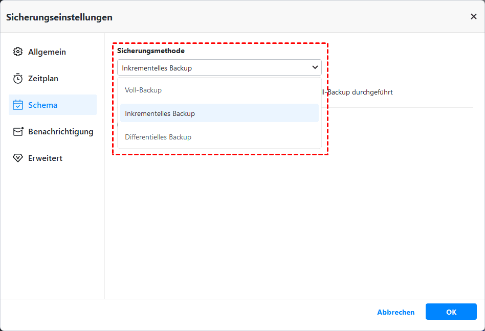 Um eine Sicherungsmethode für eine geplante Sicherungsaufgabe zu konfigurieren, müssen Sie das Register „Backup-Schema“ aufrufen und dann die gewünschte Sicherungsmethode auswählen. „Inkrementelles Backup“ ist die standardmäßige Backup-Methode.
