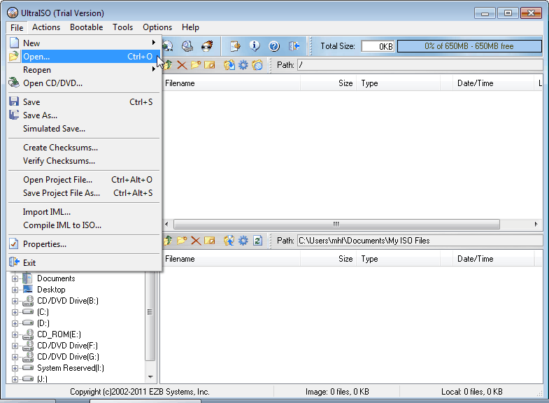 2. Im Hauptmenü wählen Sie „File“ -> „Open“, um die UBackup-ISO-Datei dem Projekt hinzuzufügen.