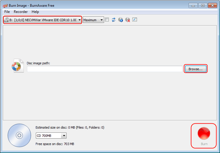 2. Im Popup-Fenster wählen Sie Ihren Datenträger (CD/DVD oder Blu-ray-Disk) und klicken Sie auf „Browse“, um die ISO-Datei hinzuzufügen.