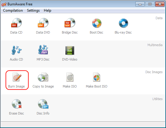 1. Starten Sie BurnAware und stecken Sie Ihre CD, wählen Sie im Hauptfenster „Burn image“.
