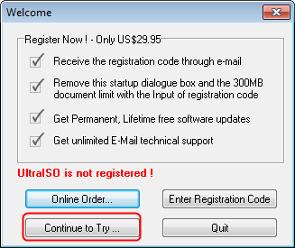 1. Laden Sie UltraISO herunter und installieren Sie es. Starten Sie die Software und klicken Sie auf „Continue to Try“, um Testversion zu verwenden.