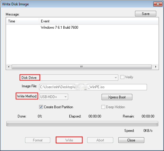 5. Im Popup-Fenster wählen Sie Ihr USB-Festplattenlaufwerk, und wählen Sie eine „Write Method“ und dann klicken Sie auf „Write“.