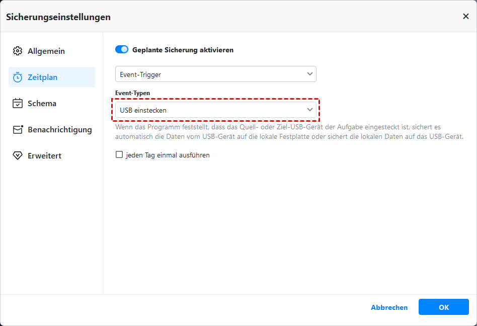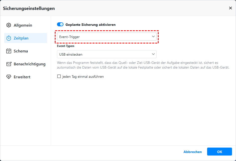 UBackup bietet fünf geplante Synchronisierungsmodi: Täglich, Wöchentlich, Monatlich, Event-Trigger und USB einstecken, um Dateien/Ordner mit anderen Speicherorten zu synchronisieren.