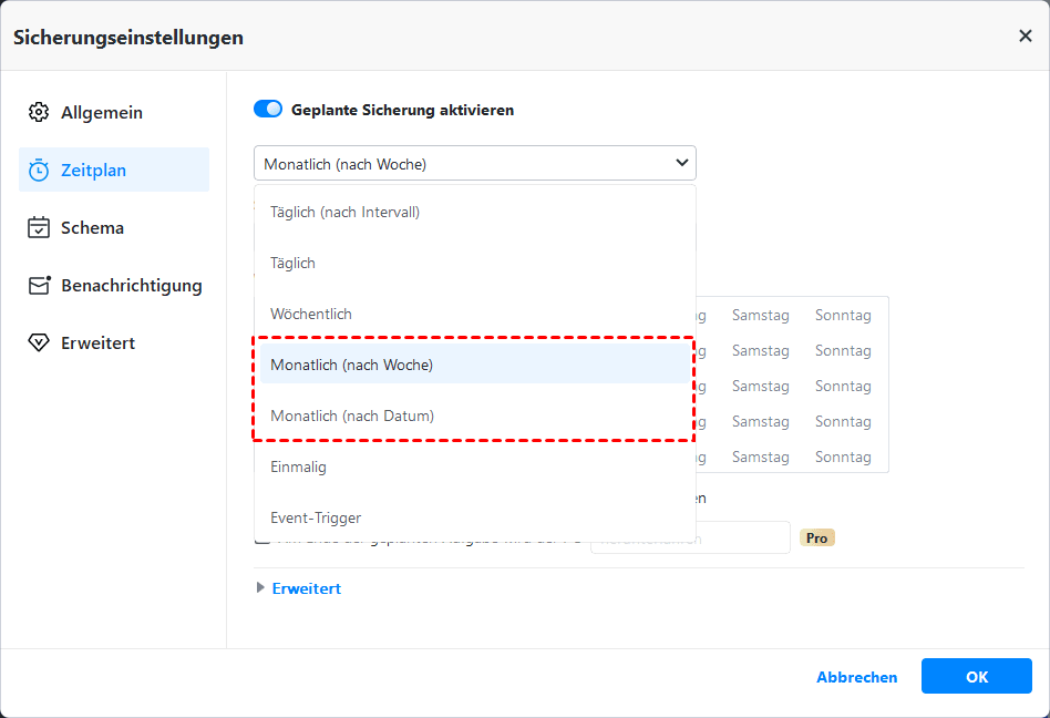In dem Fenster Zeitplaneinstellungen können Sie die Häufigkeit von der Synchronisierung festlegen: