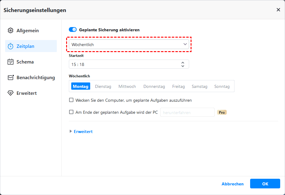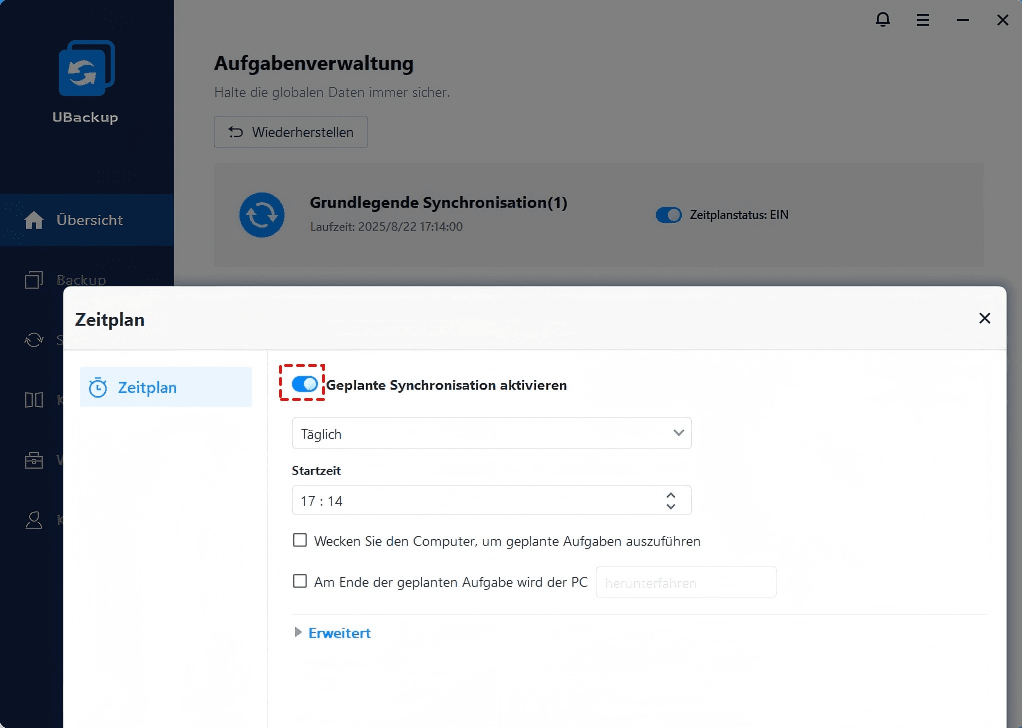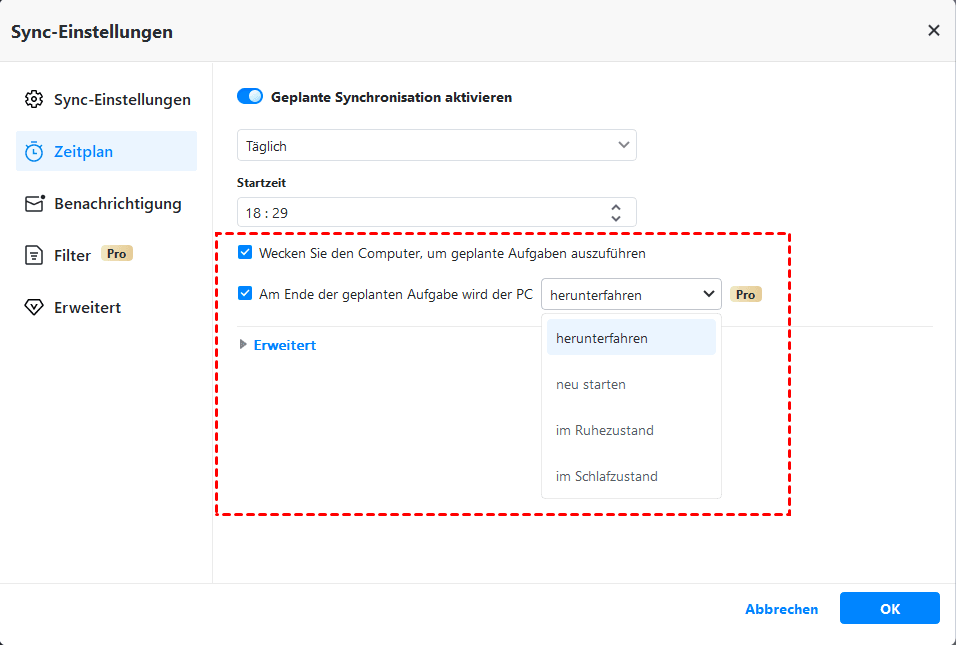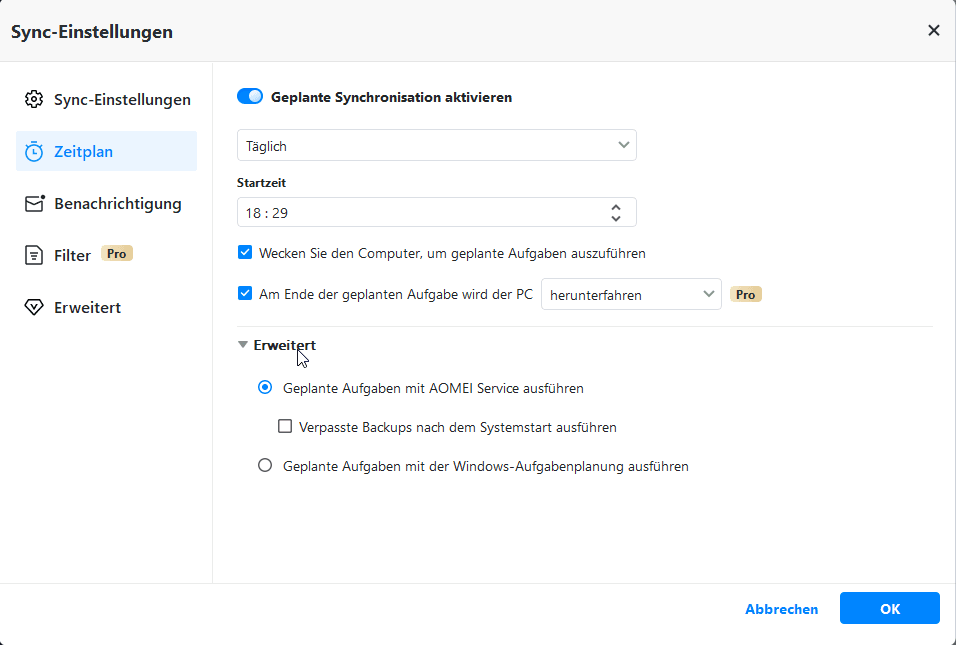 In den Zeitplaneinstellungen „Erweitert“ können Sie „Verpasste Sync um beim nächsten Systemstart ausführen“ ankreuzen, damit beim nächsten Systemstart eine verpasste Synchronisierung ausgeführt wird, wenn der PC vor dem geplanten Synchronisierungszeitpunkt heruntergefahren wird.