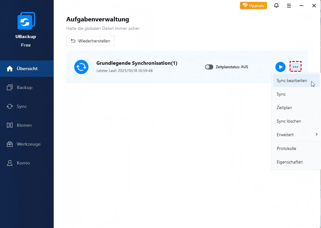 Wenn Sie eine Synchronisierungsaufgabe erstellt haben, aber die Funktion „Zeitplan“ nicht aktiviert haben, können Sie die Synchronisation-Seite, indem Sie auf die Schaltfläche „Sync bearbeiten“ unter der dreizeiligen Schaltfläche klicken. Dann können Sie genau wie Methode 1 einen Zeitplan erstellen.