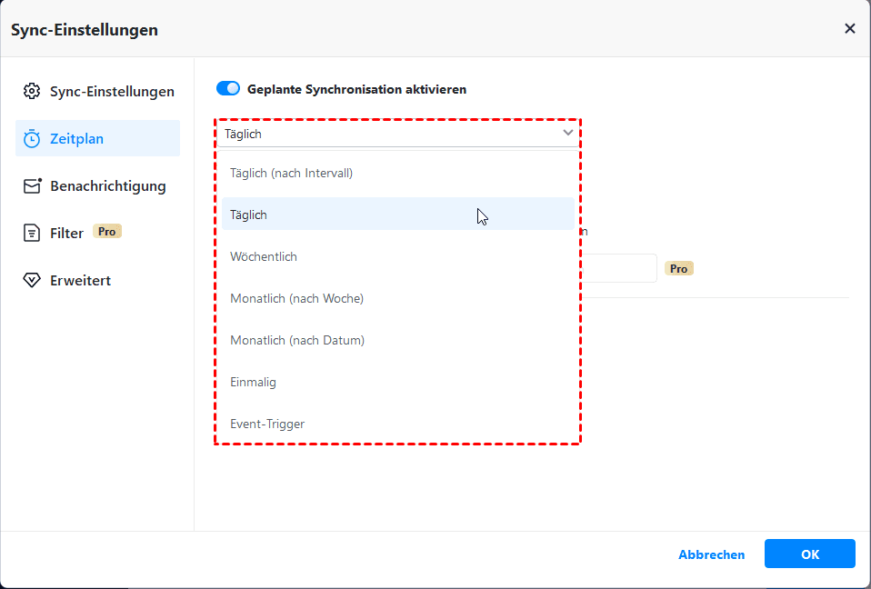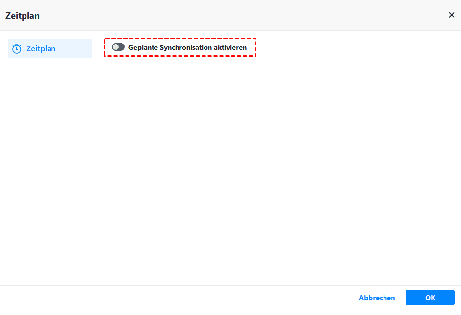 Hinweis: Die geplante Synchronisierung ist nur in der Grundlegende Synchronisation und der Spiegelsynchronisation verfügbar. Bei der Echtzeit-Synchronisation kann dies als speziell geplante Synchronisierung betrachtet werden.