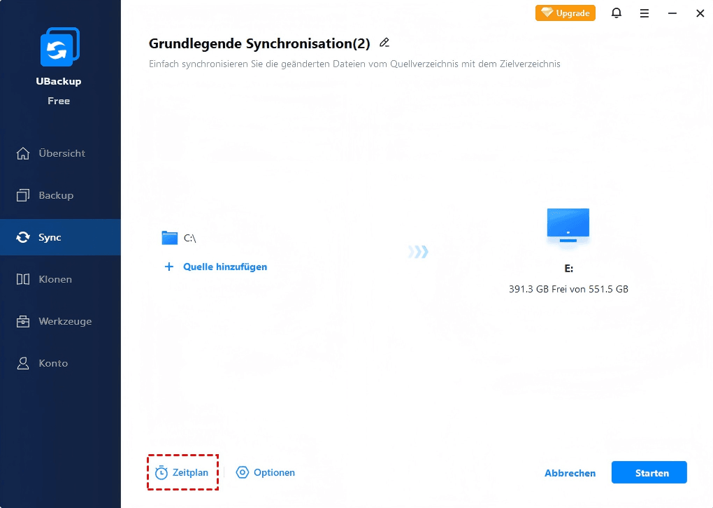 Wenn Sie keine geplante Dateisynchronisierungsaufgabe erstellt haben, klicken Sie auf „Sync“ und wählen Sie „Grundlegende Synchronisation“ oder „Spiegelsynchronisation“. Hier können Sie auswählen, welche Ordner Sie synchronisieren möchten. Hier finden Sie auch die Option „Zeitplan“.